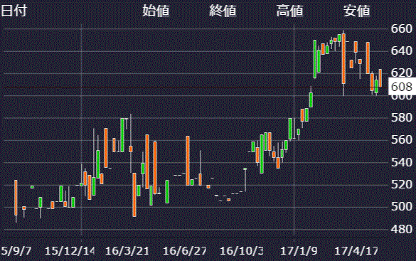 中期的な株価動向です。580円~600円付近に抵抗線(サポートライン)があると見ました。